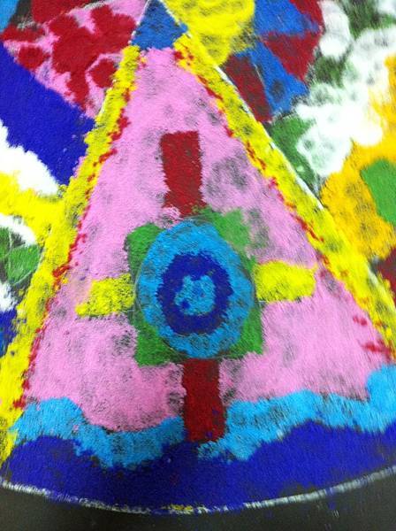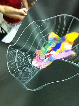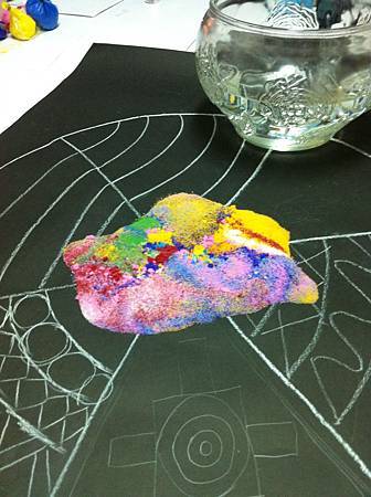 短短的數十分鐘,經歷了一段生滅過程。在拿起刀子開始,粉彩筆不再是筆,鹽也不再是鹽,開始有了新的角色。紅的、黃的、方形、波浪、圓點,在不同的時間點完成一幅意想不到的圖案。圖案完成,到達終點,可是時間不會停留,下一個圖案在後面蓄勢待發。