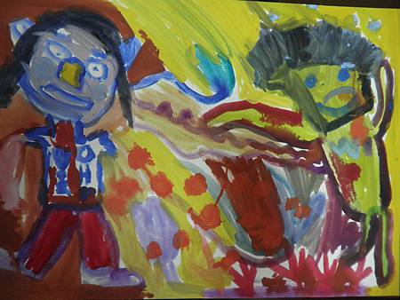 兩個孩子和大人們爬山,想必是相互扶持吧!不知道是哥哥在前面領著妹妹,還是在後頭守護妹妹的平安。哥哥已經國二,開始有升學壓力,可是對芝羽依然是諸多容忍。哥哥幫妹妹寫英文作業,妹妹卻不准哥哥用自己的電腦,還特意把插頭藏起來,讓月裡姊和哥哥都有點啼笑皆非。不過我想芝羽是知道哥哥對自己的好。芝羽最近畫了一張和哥哥一起的圖畫,或許多少畫出芝羽一些放在她心中說不出的話吧!給大家欣賞。